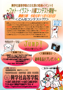 カメラを持参して「ジャンプ」というお題で写真撮影をします。撮影した写真は、11月10日(日)に高等部で行われる「興友祭(文化祭)」のフォトコンテストに出すことができ、入賞すると豪華賞品が貰えます!!!参加お待ちしてます(≧▽≦)